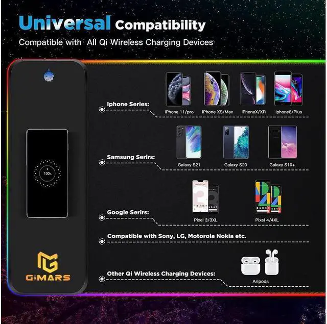 15W Max Fast Qi Wireless Charging Mouse MatThis Mouse Pad Built-in 15W wireless fast charging compatible with smartphones which support wireless charging such as iPhone 8/X/XR/XS/11/11 Pro, Samsung Galaxy 10/S9/S8 Plus, Galaxy Note 9/8, and all other
