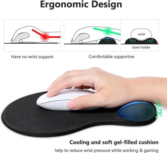 Gel Cushion: Filled with excellent cooling gel. The soft and comfortable gel-filled cushion offers your wrist maximum comfort and support. Ergonomic Mouse Rest alleviates pressure on your wrist by elevating it on a comfortable angle for your long-term use of computer.
