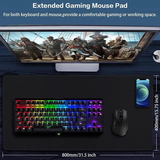 Extended Size: The size of this XXL large mouse pad is 31.5 × 15.7 inch, which is big enough to fit your full-sized keyboard, mouse, laptop, or other item on the desk, providing more space for professional gaming or office work. Besides, you can also use this extended mouse pad as a desk pad, writing pad, platform protection mat. Keep your desk clean and uncluttered.
