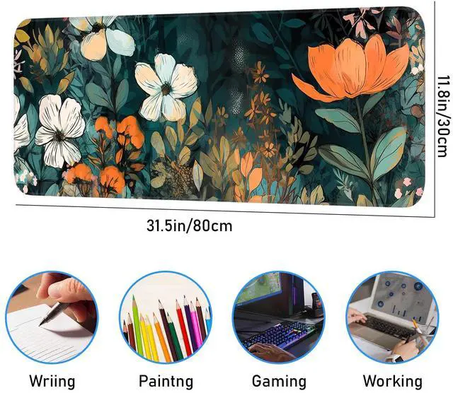 KEHIPI Floral Plant Mouse Pad, Non-Slip Rubber Base Stitched Edges, Large Gaming Mouse Pad for Laptop, Computer, Keyboard, 31.5 x 11.8 Inch, Desktop Decor