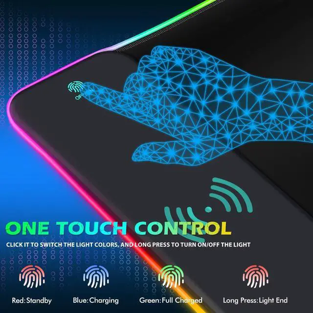 providing a unique atmosphere when playing games or working. The memory function helps to remember the light mode selected when it was last turned onEnjoy the joys of technologyJust place your phone wireless charging earphones or watch in the designated wireless charging area and it will automatically start charging. The mouse mat is powered by Type-C and a charging cable is included in the package Just plug in the Type-C cable to your power adapter or computer and you're ready to go. XXL Large 4MM Thickness Enhances Gaming ExperienceUpgrade your office desk or gaming station with our extra-large desk pad measuring 800x300x4MM.