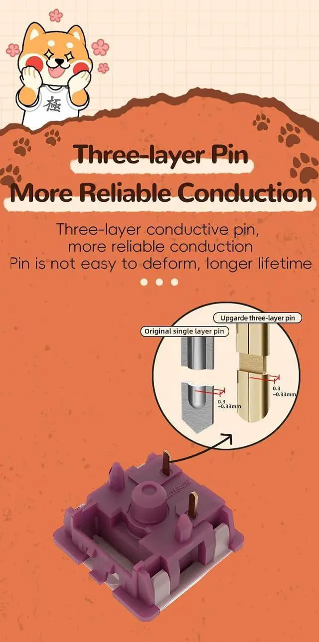 [SMD LED & Plug-in LED] Gateron mountain top key switch is SMD LED and plug in LED compatible. And the pins are upgraded to tri-layer pin which is much more stable. 5-pin structure is much more reliable for the key switches. This switch can be suitable for most mx mechanical keyboard.