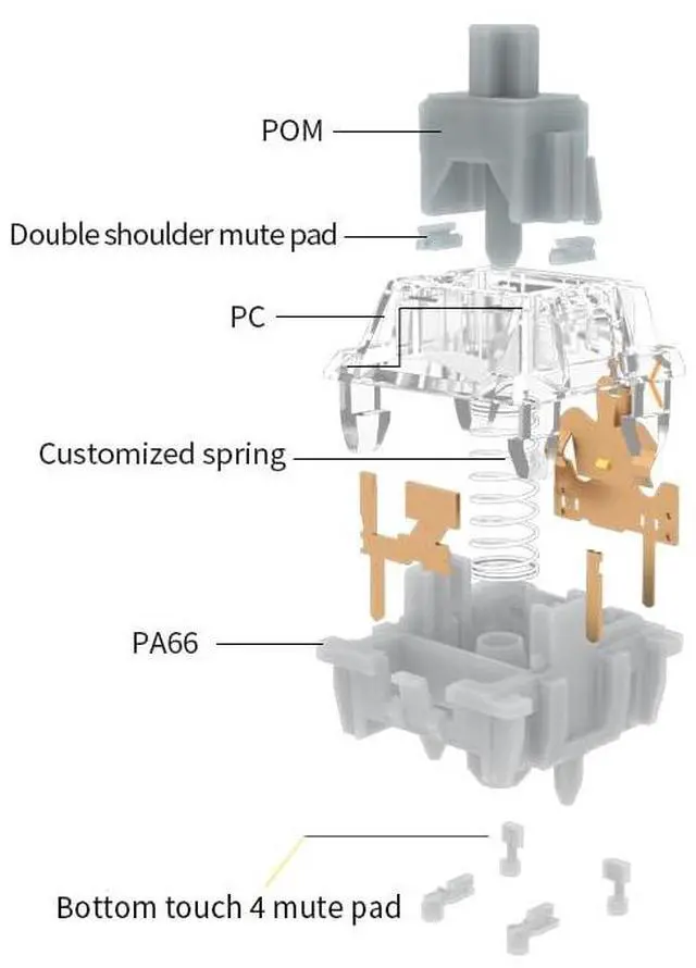 [Spec]Operating Force: 45±15gf, 35pcs included in each pack, Pre Travel: 1.8±0.5mm, Total Travel: 3.6mm Max, Stem Material: POM, Top Housing Material: PC, Bottom Housing Material: Nylon, Spring: 20mm Spring, LED Support: SMD, Pins: 5-Pin, Pre-lubed: Yes, Keystroke: 100,000,000 cycles