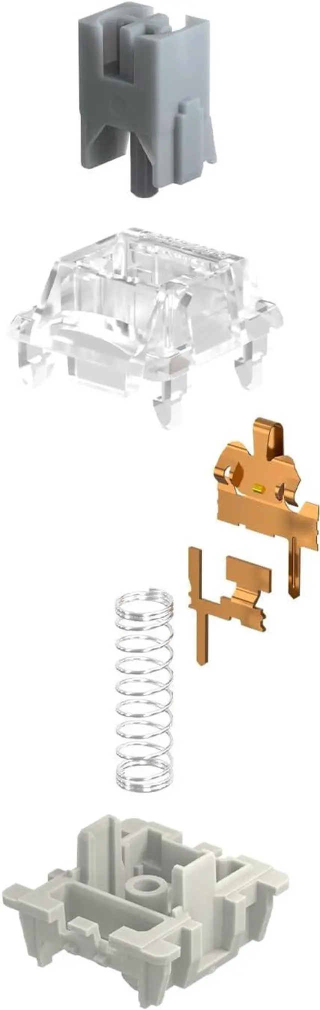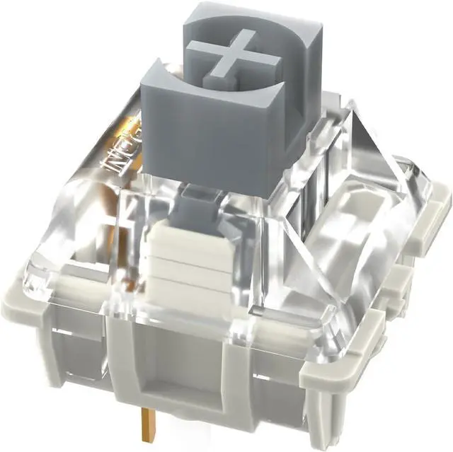 [Specs] Operating Force: 45±15 gf, Stem: POM, Top Housing: PC, Bottom Housing: Nylon, Pre Travel: 1.2±0.3 mm, Total Travel: 3.4 mm, Spring: Spring steel, Pins: 3-Pin, LED Support: Plug In or SMD, Pre-Lubed: Yes, Keystrokes: 60 million