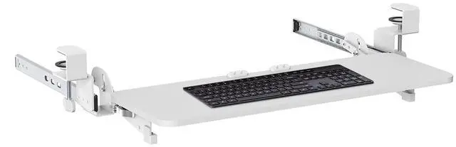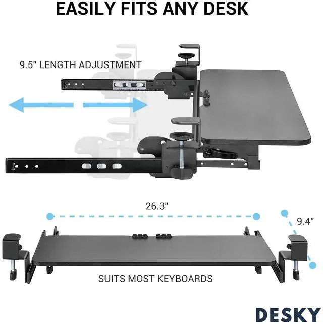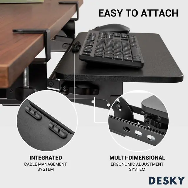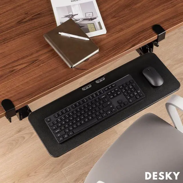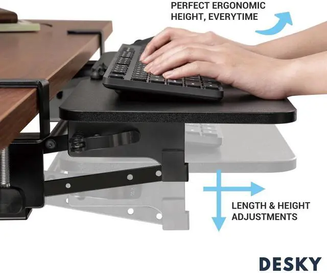 Free up desk space, optimise your position at your desk and keep your keyboard safe when out of use with the Desky Keyboard Tray. Designed to accommodate any size keyboard comfortably, our bespoke sliding keyboard tray for desk puts your keyboard right in your lap when seated, allowing the most comfortable wrist positioning and helping prevent RSI and carpal tunnel syndrome. FeaturesEasy height adjustment allows you to lock in the perfect heightLocking handle allows you to easily secure, without the need for toolsRubber pads on mounting clamp protect your desktop from damageIn-built cable management keeps your cables out of the way and integrates with our other cable management systemsProtect Your WristsFinding the perfect position for your wrists when typing can actually prevent you from injury.