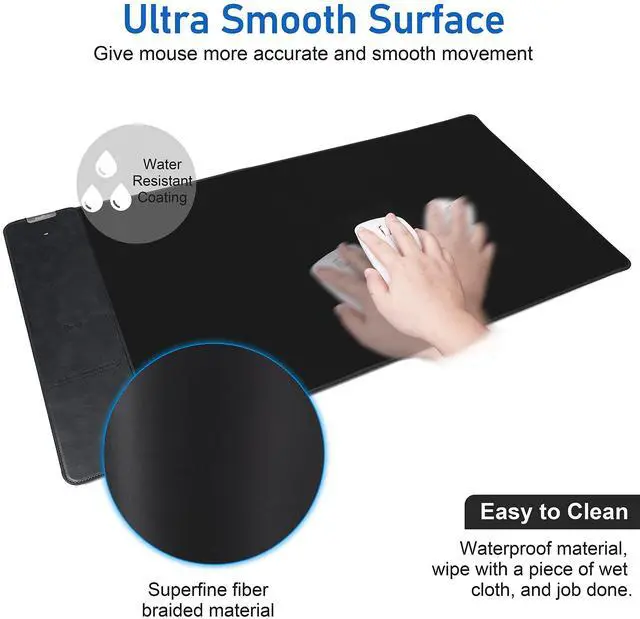 - [Non-Slip Rubber Base] The bottom of this wireless charging desk pad is designed with non-slip natural rubber to enhance stability and to ensure your stable operation of the mouse and keyboard. Just immerse into your work or games without worrying about the annoying mouse pad movement.Stitching along the edges of the surface ensure it will never fray or peel.