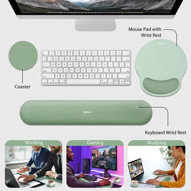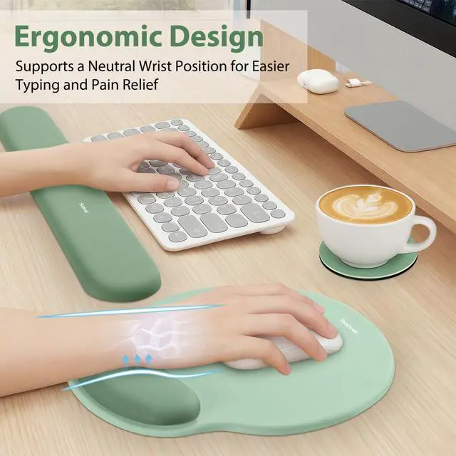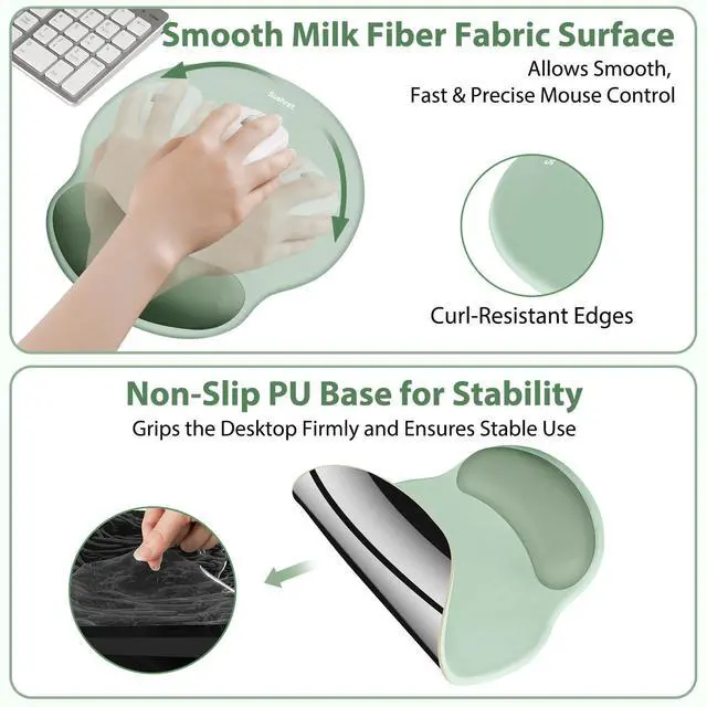 The mouse pad with wrist rest features a curved design filled with memory foam that fits the natural contour of your wrist, helping improve hand posture during mouse use while providing comfortable support over extended periods.