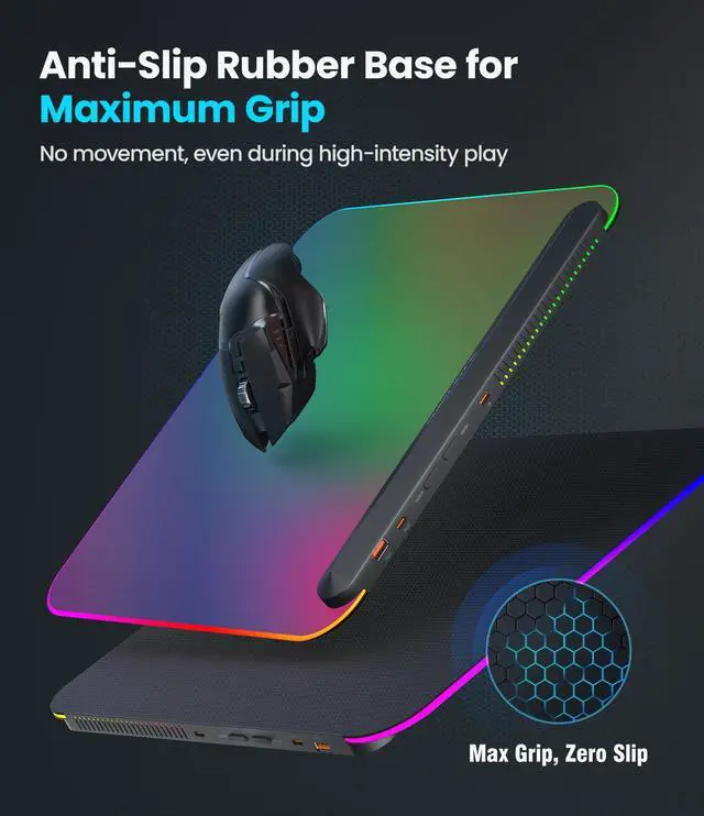 BladeHawks RGB Gaming Mouse Pad: Full RGB Lighting & Enhanced Performance Upgrade your setup with the Blade Hawks RGB gaming mouse pad. Featuring vibrant RGB backlighting with 6 dynamic lighting modes and colors, including static color, color cycle, wave, spiral, flame, and beam movement, you can easily customize your desk mat lighting to match your gaming or work mood. Designed with a micro-textured surface, this computer mouse pad ensures precise control and smooth tracking, ideal for long gaming sessions. The anti-slip rubber base keeps the mouse pad for desk firmly in place, even during intense gameplay. With both USB 2.0 and Type-C ports, enjoy a fast, low-latency connection for a seamless experience. The Type-C port offers compatibility with various wireless receivers, ensuring flexibility for all your devices and making it a perfect choice for wireless mouse setups. To keep your pad cool during extended use, the ventilation design ensures efficient heat dissipation, preventing overheating and maintaining peak performance for longer gaming or work sessions. This large mouse pad is a perfect addition to any desk, offering both style and functionality. It's an ideal gift for gamers or anyone who loves RGB lighting and performance-driven accessories. Enhance your office desk accessories with this versatile and high-performance mouse pad.