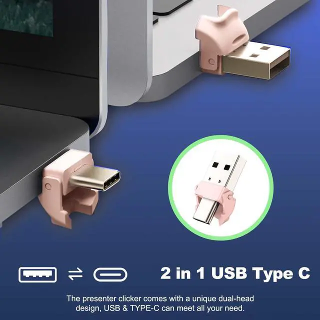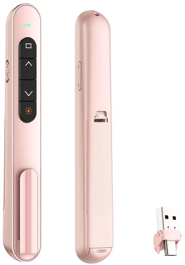 Enhance your presentations with this wireless presentation clicker! Designed for smooth control over your slides, this versatile powerpoint clicker is suitable for teachers, business professionals, and speakers alike. With its user-friendly design, you can effortlessly navigate through your slides with just a click.This presentation clicker features a range of advanced functionalities, including a built-in light pointer that helps you highlight key points during your presentation. The USB C wireless clicker ensures compatibility with various devices, making it an functional tool for anyone who frequently presents on computers or laptops.This pointer clicker for presentations boasts an impressive wireless range, allowing you to move around the room while keeping your audience engaged. Its ergonomic design fits comfortably in your hand, providing ease of use during long presentations.It's the slideshow clicker for those who demand reliability and efficiency. Whether you're leading a board meeting, teaching a class, or delivering a keynote speech, this presenter clicker will ensure you stay in control. Upgrade your presentation experience with this presentation pointer and make every slide transition smooth and impactful!
