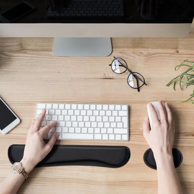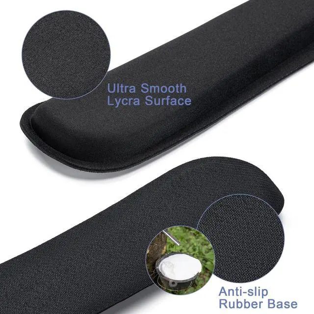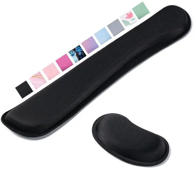 [WRIST PAD FOR KEYBOARD]: 17.5*3.5 inches keyboard wrist rest and 5.6*3 inches mouse wrist rest making it a perfect fit for most desks; Fits most computers and laptops. It can improve the posture of the forearm and wrist, avoid joint and wrist problems, and release pressure on the elbows and shoulders during prolonged use of the computer [MORE COMFORTABLE & SUPPORTIVE]: The keyboard wrist rest set surface is made from a super soft and breathable lycra material, providing you with lightweight, comfortable, durable and skin-friendly touch, ideal for long time use; The inner cushion is made of comfortable memory foam and highly resilient rubber, can rebound slowly and is not easy to deform [NON-SLIP RUBBER BASE]: The bottom is supported by a rubber base, and clear patterns are drawn on it to achieve anti slip effect, providing stable operation for your mouse and keyboard. You can work or play games with ease, without worrying about the pad slipping or moving [ERGONOMIC DESIGN]: Designed to keep your wrist in a straight line with the keyboard and mouse, this ergonomic mouse pad wrist rest set provides comfortable support, it can let you forget sore wrists and fingers when typing and using a mouse [WIDE APPLICATION]: Keyboard pad combo specially designed let it super comfortable, portable fit most computers, notebooks, mouse. Reduce strain on elbows shoulders and make joints and wrists more comfortable for workers, gamers, writers, editors who are engaged at long typing work