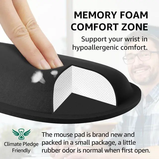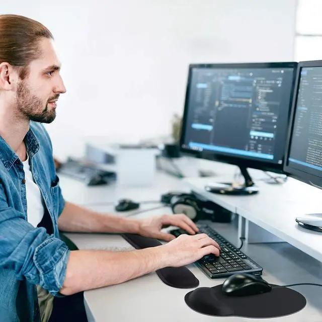 The ergonomic 2-in-1 set promotes proper wrist alignment with the keyboard and mouse, providing comfortable support to reduce fatigue from repetitive tasks. Memory foam cushioning maintains a neutral wrist position and minimizes pressure points. The non-slip rubber base keeps both pads securely in place for stable typing and mouse use. Includes a 17.2 x 3.12 x 0.9 inches keyboard wrist rest and a 9.8 x 8.6 x 0.9 inches mouse pad with wrist rest, fitting most laptop and gaming keyboards for ergonomic comfort at home, office, or during gaming.