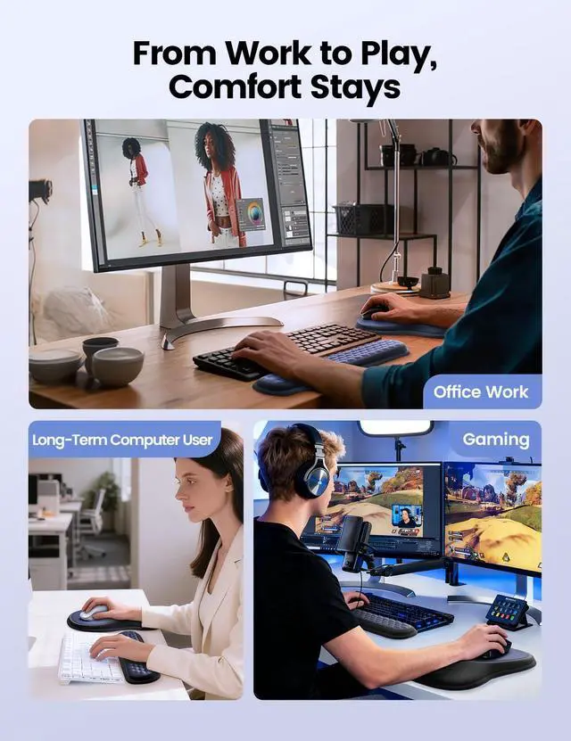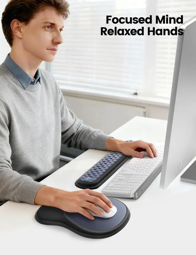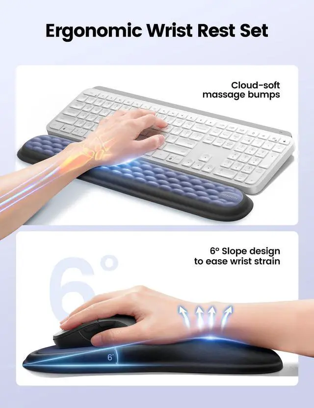 Bring elegance and lasting comfort to your workspace with this ergonomic wrist rest set, designed to care for your wrists during long hours of typing, gaming, or creative work. The set includes a keyboard wrist rest and a mouse pad wrist rest, both crafted with high-density memory foam that cushions every movement while providing gentle, cloud-like support. The 6° gradual slope design reduces wrist strain and promotes natural hand alignment, helping to ease pressure on muscles and joints. With a soft, mousse-like texture, the surface feels smooth against the skin, while the durable Lycra fabric cover ensures breathability and resistance to daily wear. Available in stylish color options such as classic black, calming blue, and elegant pink, this set blends seamlessly into modern deskswhether for office, home, or gaming setups. Non-slip bases keep the rests firmly in place, ensuring stable support during every task. Whether you are typing reports, editing designs, or enjoying long gaming sessions, this wrist rest set turns your desk into a stress-free comfort zonecombining functionality, aesthetics, and a touch of romance for your daily routine.