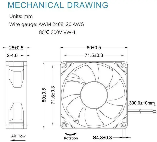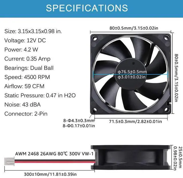- Rated Current: 0.35Amp; Speed: 4500RPM; Air flow: 59CFM; Noise:43dBA