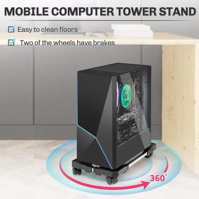Adjustable PC stand fits most computer tower sizes. Four casters are designed to provide mobility and stability, two of which have brakes to keep it stationary when needed, and the hollow design on the bottom increases airflow and speeds up heat dissipation.