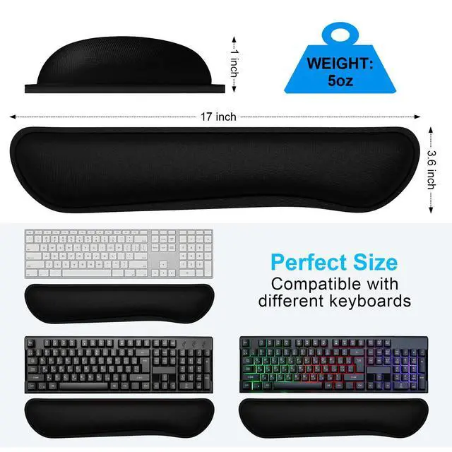| Size | Keyboard Wrist Pad: 17x3.6x1 inch Mouse Wrist Pad: 6.3x3.25x1 inch | Keyboard Wrist Pad: 17x3.6x1 inch Mouse Wrist Pad: 6.3x3.25x1 inch | 6.3x3.25x1 inch | Keyboard Wrist Pad: 17x3.38x0.9 inch Mouse Wrist Pad: 10x9x0.9 inch |