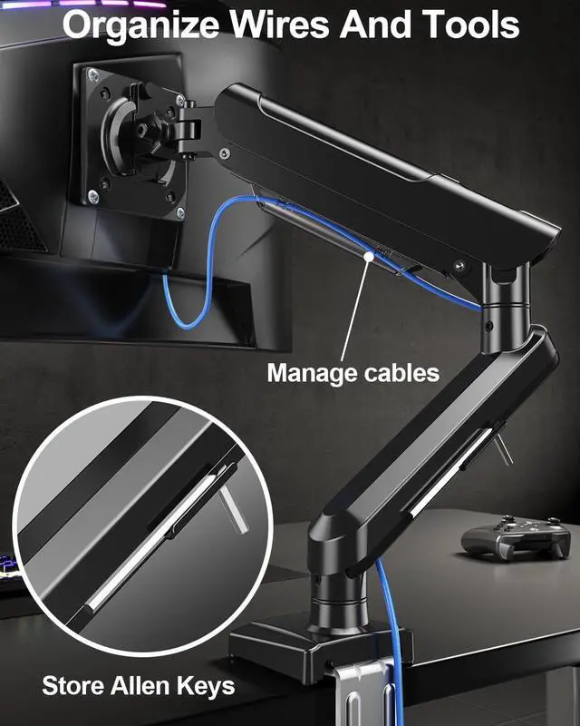 Perfect Space Saver: Free up valuable desk space with this vesa monitor mount. Comes with the cable management parts, keeping your workspace tidy and organized. A specially designed place to store your Allen key allows you to easily find the right tool when needing to make adjustments.