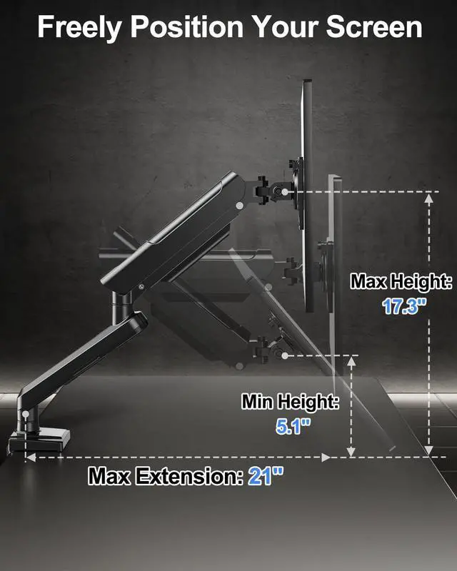 Flexible Adjustment: Freelift full motion single monitor desk mount allows you to adjust your monitor to the perfect height and distance, 180° swivel, tilt +85° to -45°, 360°rotation, increasing your productivity
