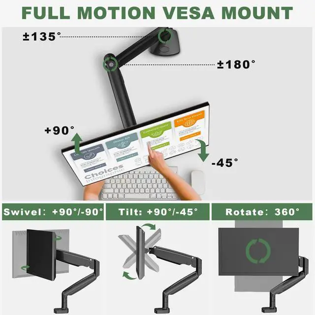 Working from home has had its challenges, especially when it comes to ergonomics. UPGRAVITY single monitor mount features +90°/-45° tilting, +90°/-90° swiveling and 360° rotating from landscape to portrait mode, ensuring perfect positioning for ergonomic viewing and reducing shoulder, neck, and eye strain.