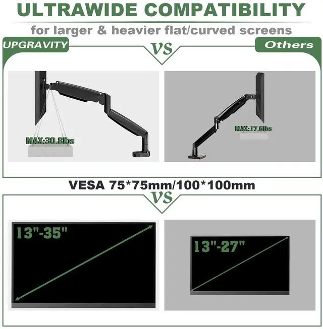 This ultrawide monitor mount is designed for larger and heavier displays ranging from 13 to 35 inch, holding computer screen weight up to 26.5lbs. With the upgraded gas spring mechanism, the arm can be extended to 22.8 inch reach and lifted to 20 inch high, which provides more flexibility and range for your equipment.
