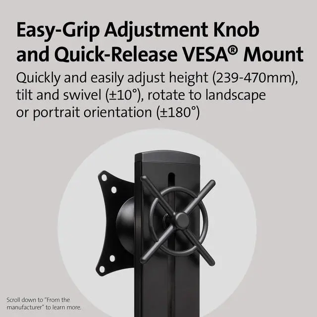 Finding the correct ergonomic monitor adjustment is easy — even for desks with a shallow depth — with the SmartFit Space-Saving Single Monitor Arm. Easy, nonpermanent installation includes necessary tools and a preinstalled C-clamp that faces the front of the desk, making installation much simpler, especially in tight spaces (optional grommet mount included). An easy-grip adjustment knob allows you to quickly and easily adjust height (9.4”-18.5”), tilt and swivel (+/- 10°), rotate to landscape or portrait orientation (+/-180°), and lock your monitor in place. Sleek, sturdy, stable, space-saving, and non-marking design is perfect for home or office use. C-clamp fits desks up to 3.3 inches (85mm) thick. Grommet mount fits desks up to 1.5 inches (40mm) thick. Compatible with sit/stand desks. Supports monitors up to 32” and up to 17.6 lbs. (8 kg), and complements a modern aesthetic. Includes cable management and a quick-release VESA mount.