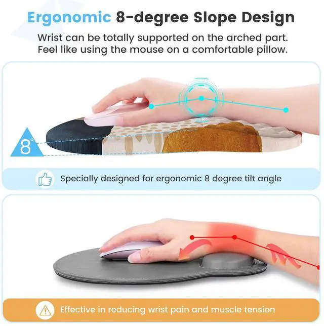 The 8-degree ergonomic inclination design fits the natural curvature of the human wrist, which can effectively relieve the pressure on the wrist, but it will not make the mouse slide off when you're not holding it.