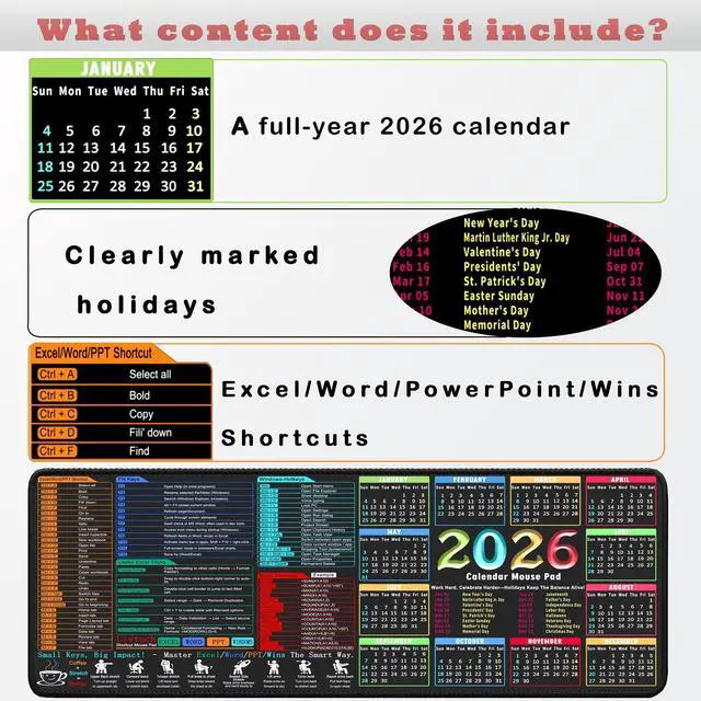 2-in-1 Mouse Pad, Keyboard Shortcuts + 2026 Calendar, 31.5"x11.8"