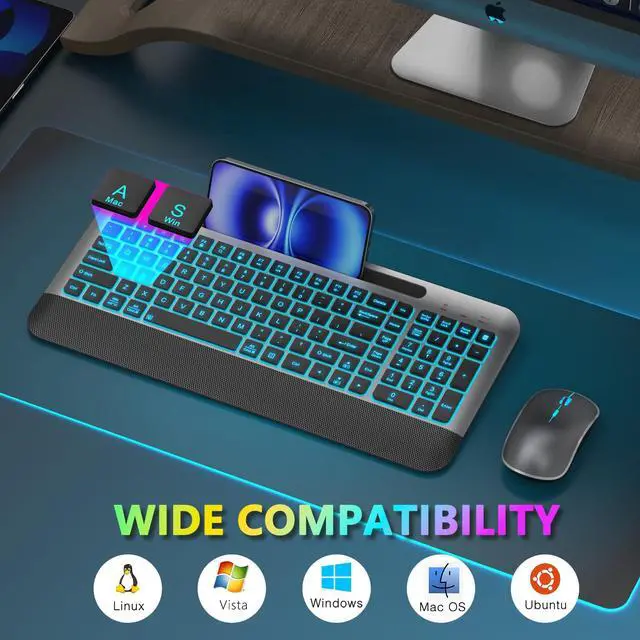 The Wireless Keyboard with Wrist Rest features a large 6.78-inch wrist rest that accommodates tablets up to 11.6 inches and effectively supports wrists, reducing muscle strain by 30%.