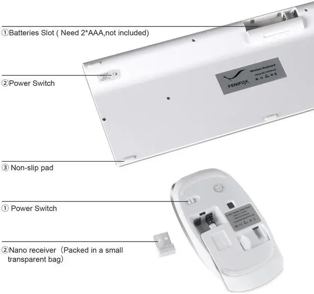 Step 1: Take out the 2.4G Nano receiver and insert batteries for each mouse and keyboard. (Batteries not included in the package)