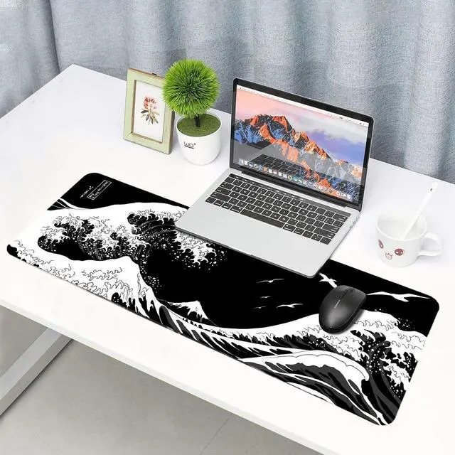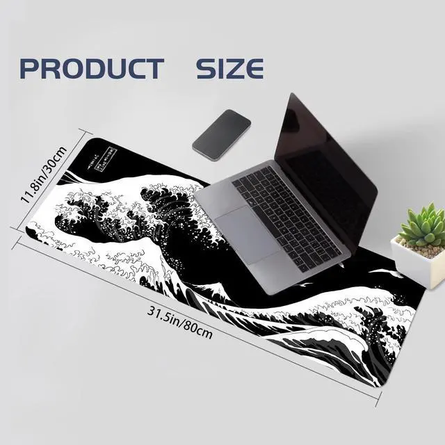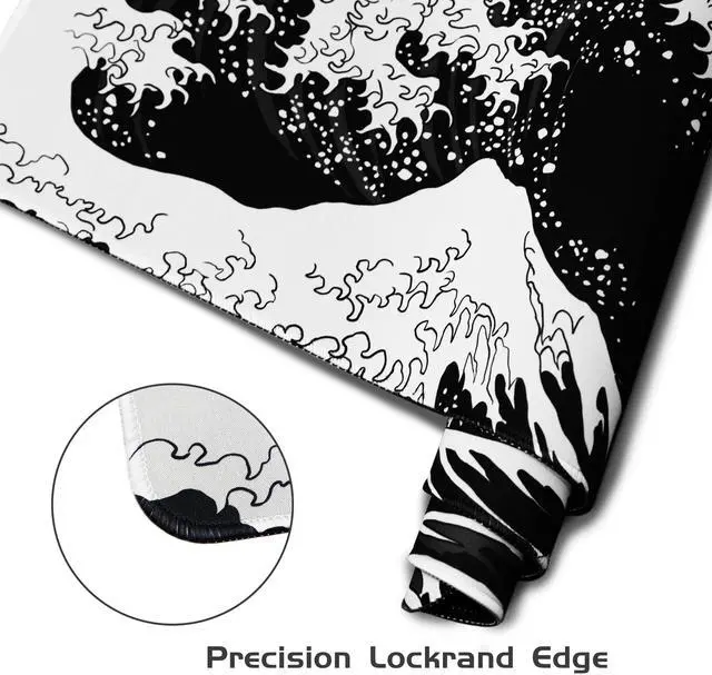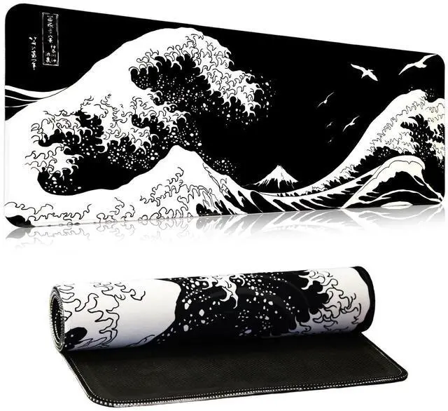 Black Large Mouse Pad Japanese Sea Wave Anime Gaming Mouse Pad Extended Kanagawa Non-Slip Rubber Base Mouse Mat 31.5 X 11.8 Inch Stitched Edges Keyboard Mice Pad Desk Pad