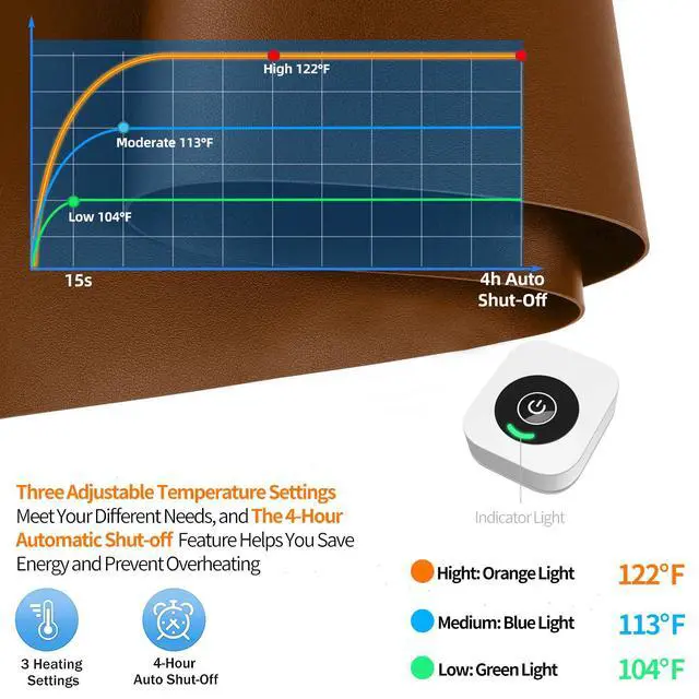 FAST HEATINGThe high quality heated desk pad for keyboard and mouse is safely certified by UL, FCC. Made of PU leather and waterproof PVC materials .This heating pad Heats up very quickly, Has 3 heat settingsRed is high, Green is medium, Blue is low,Super easy to install.