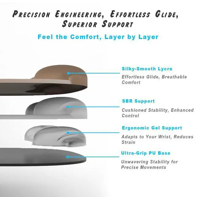 Crafted for Comfort & Performance: Our adaptive gel core offers all-day wrist support. The ultra-smooth Lycra surface delivers fluid, precise control. Its steadfast anti-slip base keeps it firmly in place. Made with durable, non-toxic materials and finished in a chic design to elevate any workspace.