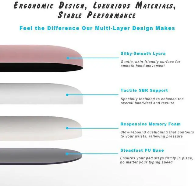 Explore the science behind the comfort. Our pad features four distinct layers: an ultra-smooth Lycra top for pixel-perfect precision; a structural SBR layer for enhanced feel; a core of responsive Comfort Gel that contours to your wrist; and a high-grip PU base that anchors it all to your desk.