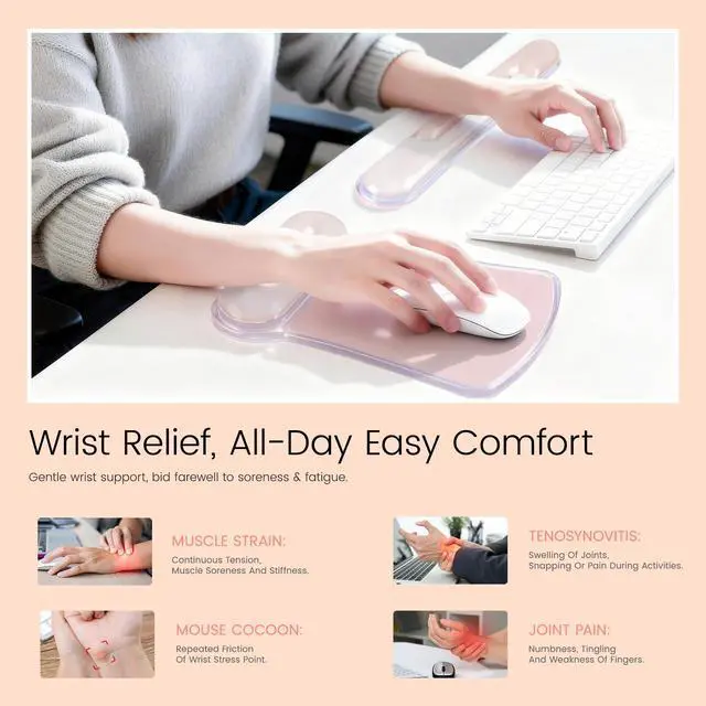 Dual Support For Keyboard & Mouse: This set designed to provide comfortable support for both hands during computer work. Aligns your wrists naturally while typing and using the mouse to help prevent and reduce strain, fatigue, and discomfort.