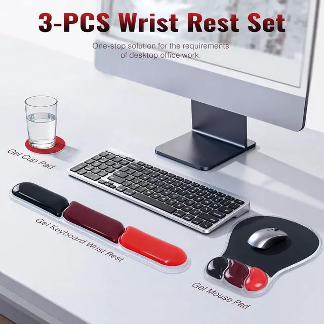 Ergonomic Gel Set: This gel mouse pad and wrist rest set includes a 8.3"x10.4" pad, a long 17.1"x2.9" wrist rest, and a 3.9"x3.9" coaster for complete desk comfort.