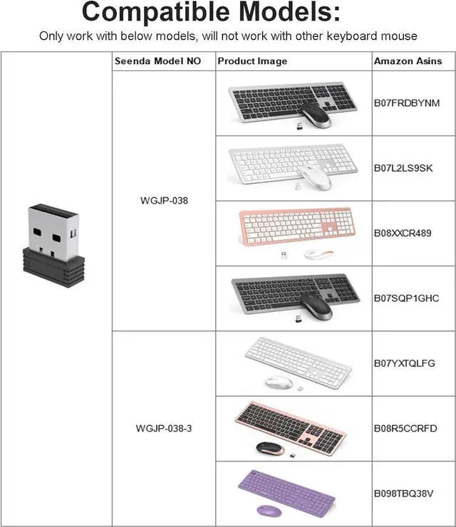 Replacement USB Receiver only Compatible with seenda SK038/SK038-3 : B07FRDBYNM, B07L2LS9SK, B07SQP1GHC, B07YXTQLFG, B08R5CCRFD, B08XXCR489, B098TBQ38V (DO NOT WORK FOR OTHER KEYBOARD AND MOUSE);