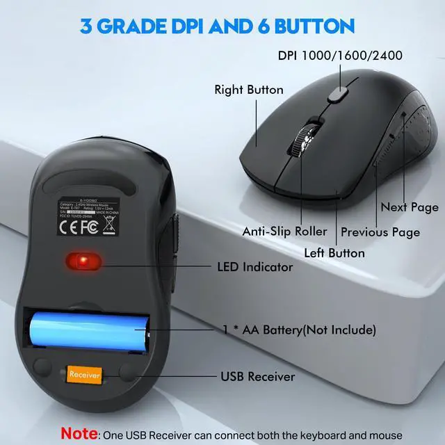 The wireless mouse has 3-level DPI (1000/1600/2400) and 6 buttons, you can choose your favorite movement speed of the cursor through click the DPI button, and the 6 buttons can meet both your work needs and entertainment needs.