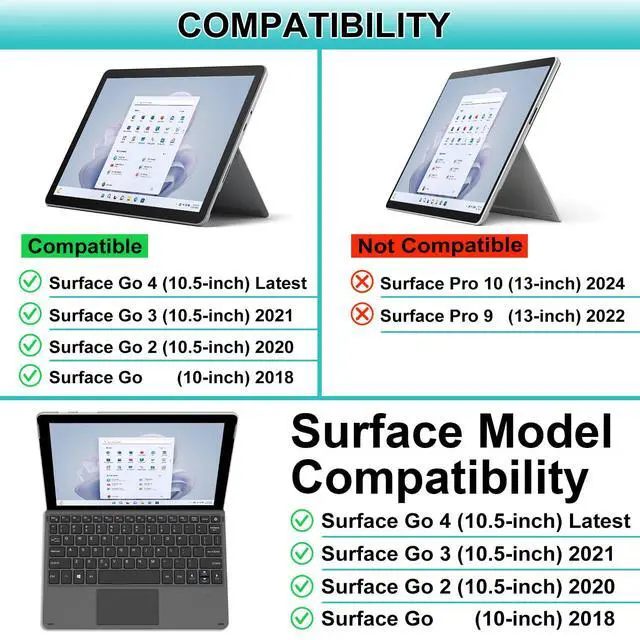 Exclusively designed for Surface Go 10-inch [2018] / Surface Go 2 10.5-inch [2020] / Surface Go 3 10.5-inch [2021] /Surface Go 4 10.5-inch [2023] Tablet Only. It is NOT compatible with any other model device. Please check the Surface model before ordering the keyboard. The keyboard is NOT suitable for Surface Pro 12-inch or 13-inch.