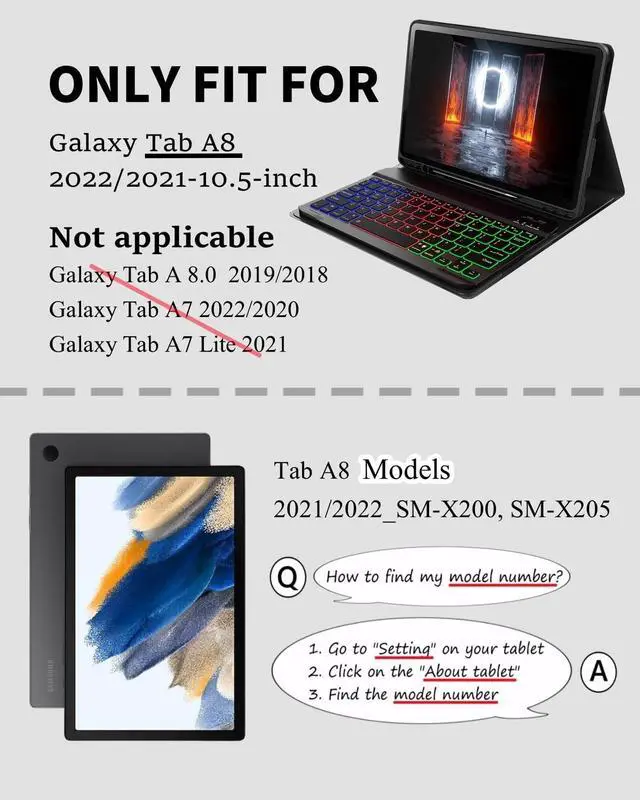 Model CompatibilityDesigned Only for Samsung Galaxy Tab A8 10.5-inch 2021/2022 (Model: SM-X200, SM-X205) , Not compatible with other models. You can check the model number before purchasing to make sure you get the correct size tablet keyboard case.
