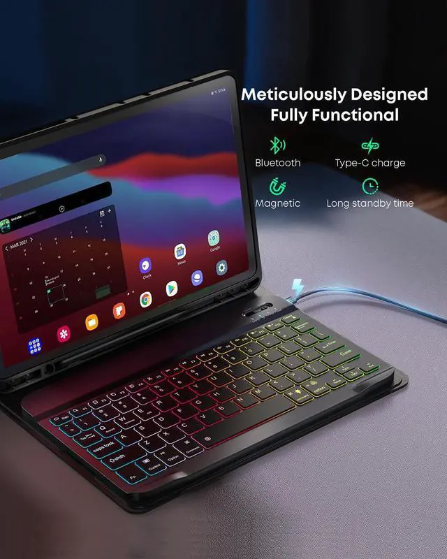 Removable Magnetic Dazzle Backlit KeyboardSamsung Galaxy Tab A8 10.5-inch 2021/2022 cases come with a removable magnetic dazzle backlit keyboard. The ultra-thin, lightweight magnetic keyboard attaches securely to the case, helping the tablet stand upright and turn it into a mini laptop in a second. Use the optional Dazzle Backlight mode to choose your favorite light from 6 color combinations and a simple white backlight for smooth typing in the dark, even when working at night.