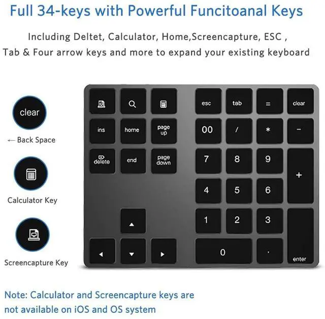 Bluetooth 3.0 can connect your devices quickly and accurately, the external 34-keys full keypad extends your existing keyboard. Operating distance up to 10M.