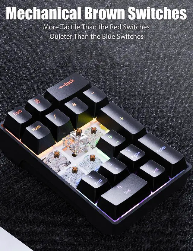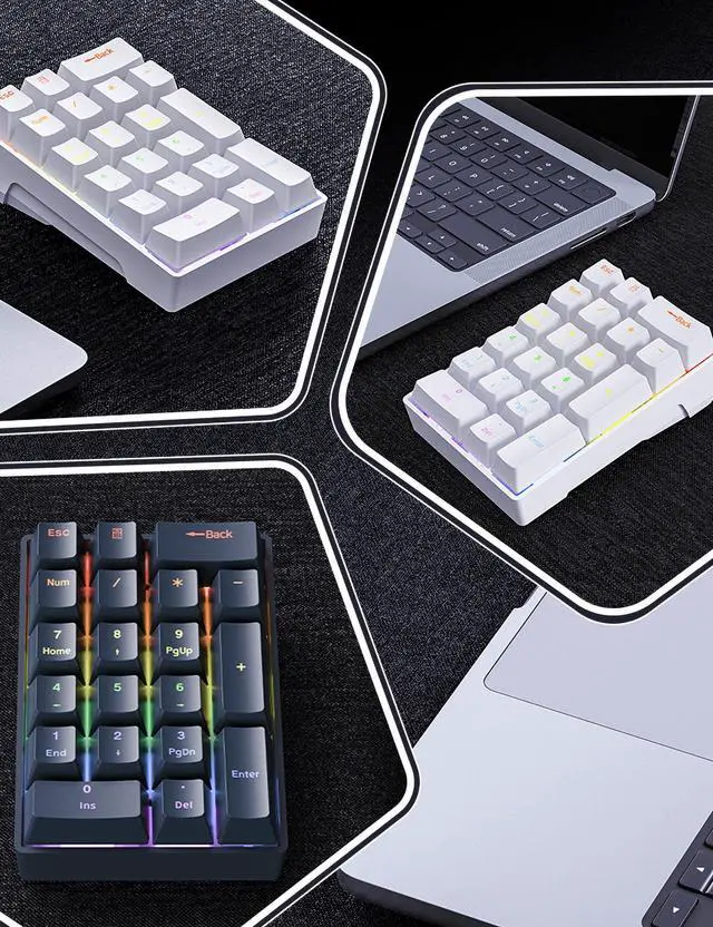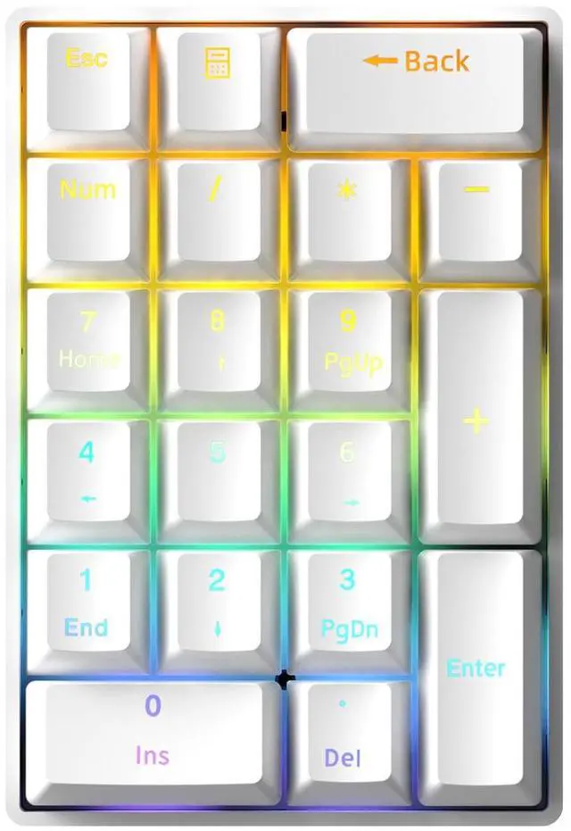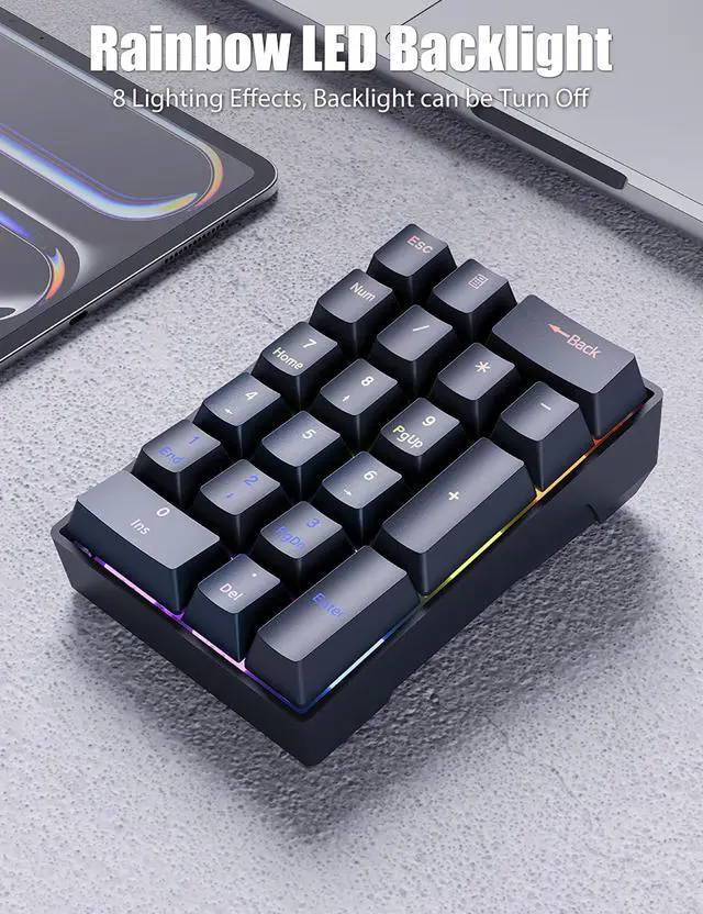 The number pad comes with double-shot injection molded ABS keycaps for enhanced durability and long-term use. The light on each key is fixed and supports 8 lighting effects. Press Calculator + 5 to change the lighting effect; press Calculator + 2/8 to adjust the brightness, with the lowest brightness turning off the lights; press Calculator + 4/6 to adjust the lighting effect speed.