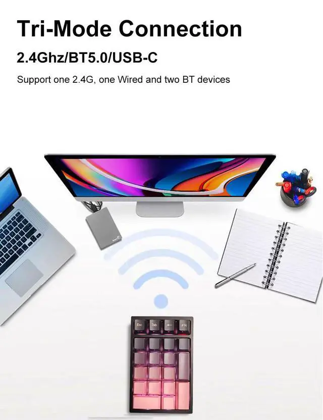 2.4G/BT5.0/USB-C: The laptop numpad supports three connection modes including Wireless 2.4Ghz, Bluetooth 5.0 and Wired USB C. Easy to connect and switch devices. No delays and dropouts. Fast data transmission. 2.4G range up to 26ft/8m, bluetooth range up to 16ft/5m.