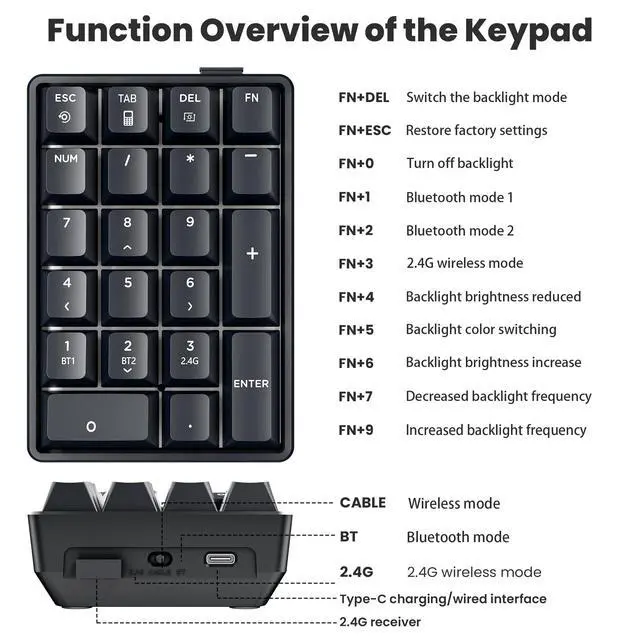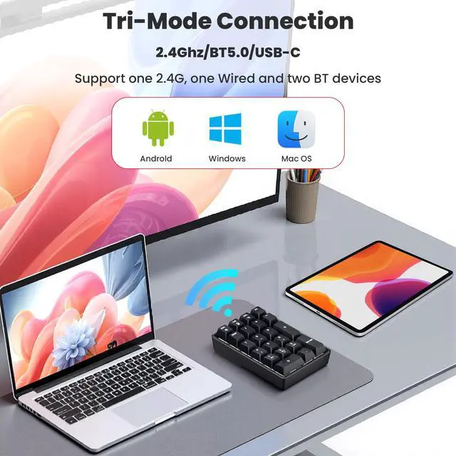 [3 Modes Connection & Multiple Devices] 21 Keys numpad supports BT 5.0, 2.4GHz, USB-A to C wired connection. You can connect up to 2 bluetooth devices, 1 wireless 2.4GHz device and 1 wired device. Connect and switch devices easily. Press FN+1/2 switch to BT1/BT2 device. Compatible with Windows, MacOS, iOS and Android systems. Support PC, laptop, Mac, smartphone, iPad and tablet.
