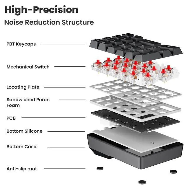 [Mechanical Red Switch & Hot-Swappable] Equipped with pre-lubed linear mechanical red switches, give an incredibly tactile feel,striking a perfect balance between clickiness and noise .Best of all the switches are hot-swappable with either 5-pin or 3-pin options, enjoy the fun of making your own keyboard.