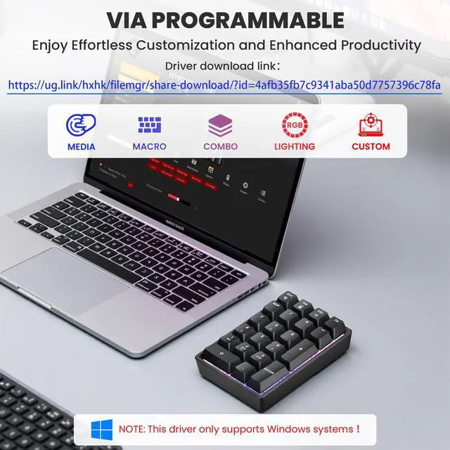 [20 Keys Programmable] Program all 20 keys except the FN key using the keypad driver. Customize each key with different functions such as system shortcuts, multimedia shortcuts, text input, one-click open for files/folders/web pages, macros, and more. This numpad features memory capability, ensuring settings are retained even after power loss. (Please see image 6 for the Keypad Driver download link). Note: This macro definition programming driver is only supported on Windows systems.