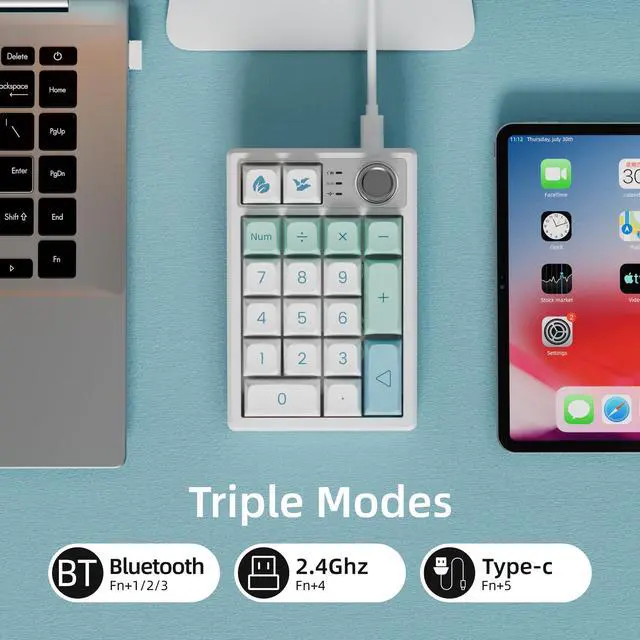 3-Mode Connectivity: Equipped with three connection options: 2.4GHz wireless, Bluetooth 5.0, and USB-C wired mode. One keypad can be paired with up to 5 devices, including 3 Bluetooth devices, 1 wireless receiver, and 1 wired connection. Quickly switch between modes using FN shortcuts. Works seamlessly with Windows, macOS, iOS, and Android on PCs, laptops, tablets, and smartphones.