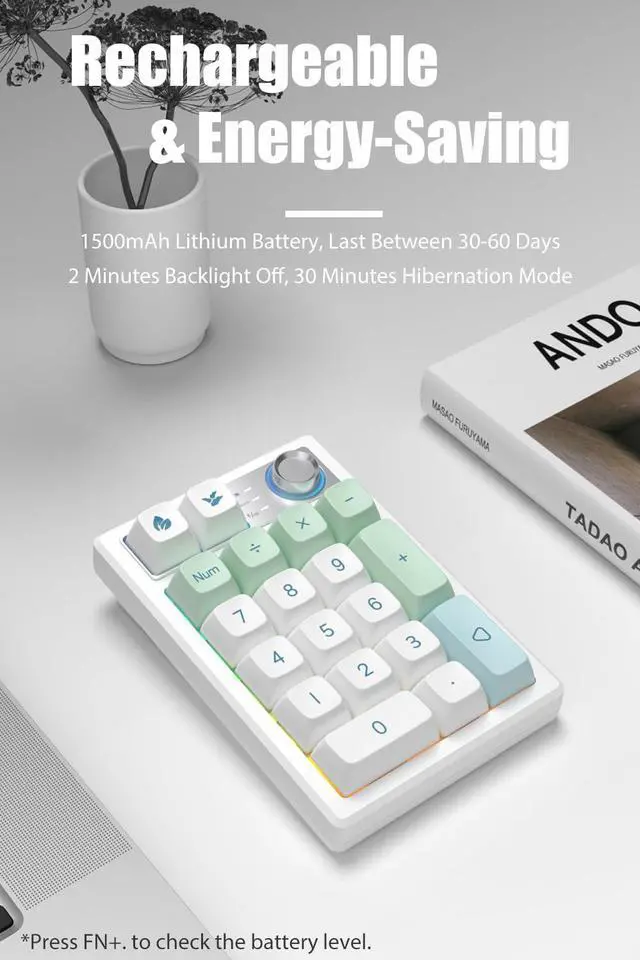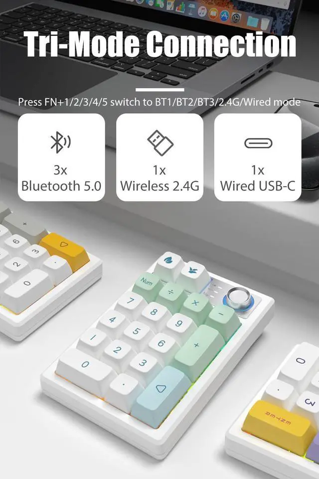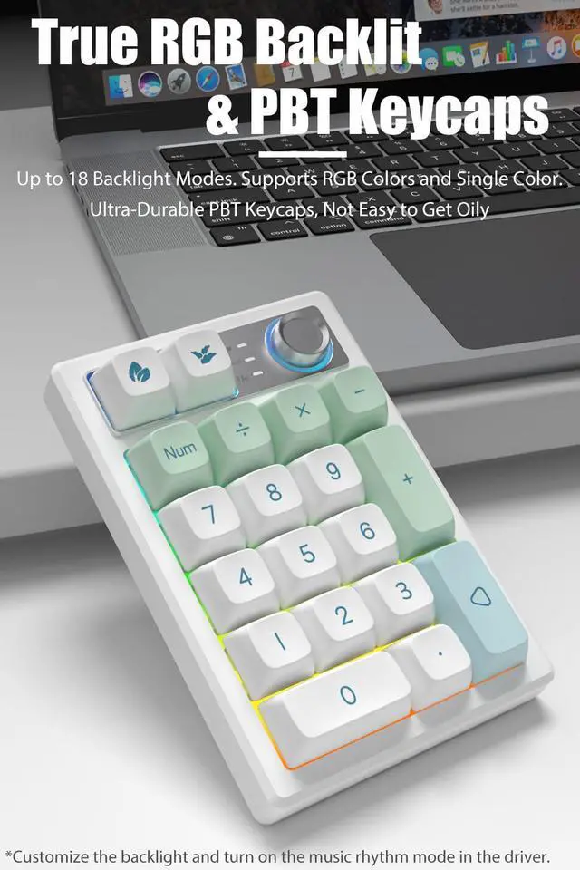 This RGB illuminated numeric keypad has up to 18 backlight modes. Supports RGB colors and single color. You can also customize the backlight and turn on the music rhythm mode in the driver. Comes with ultra-durable PBT keycaps that legends will never wear away. PBT keycaps are dry and not easy to get oily.