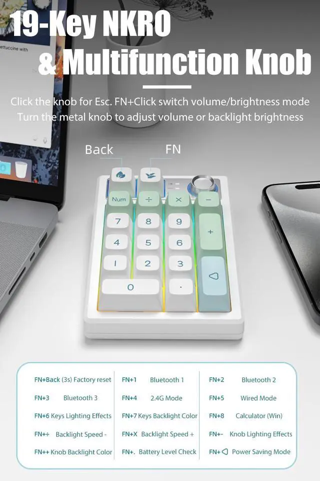 All 19 keys are anti-ghosting and non-conflict. Every keystroke is registered during intense gameplay and fast typing, no matter how many other keys are pressed at the same time. Turn the metal knob to adjust volume, click the knob for Esc. FN+Click the knob to switch to brightness mode, then turn the knob to adjust the backlight brightness.