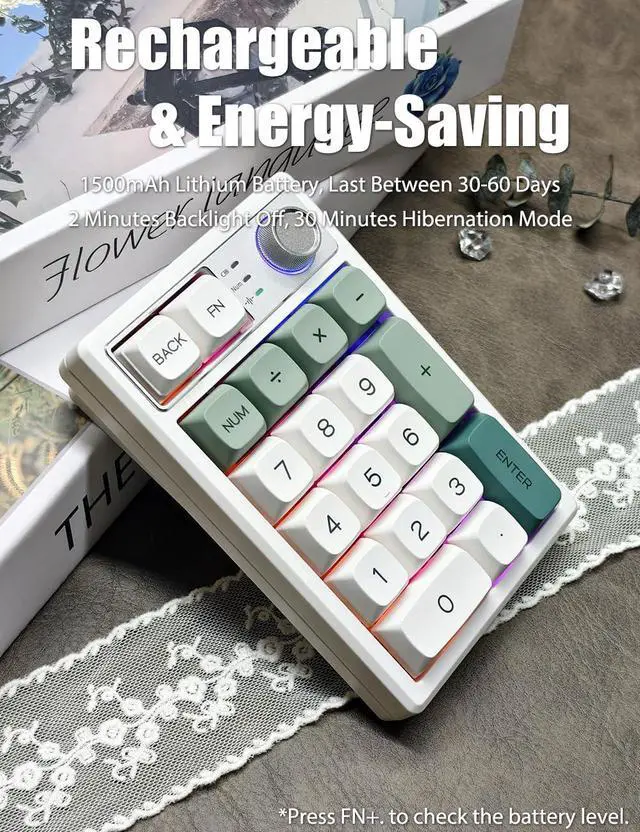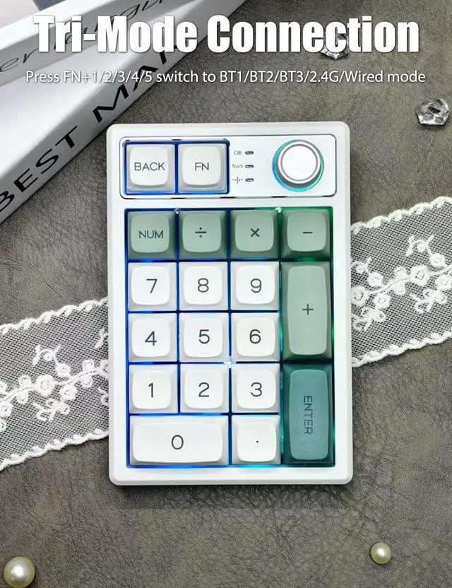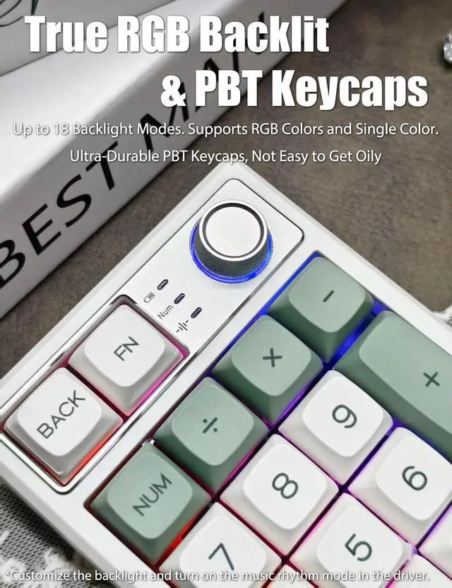 This RGB illuminated numeric keypad has up to 18 backlight modes. Supports RGB colors and single color. You can also customize the backlight and turn on the music rhythm mode in the driver. Comes with ultra-durable PBT keycaps that legends will never wear away. PBT keycaps are dry and not easy to get oily.
