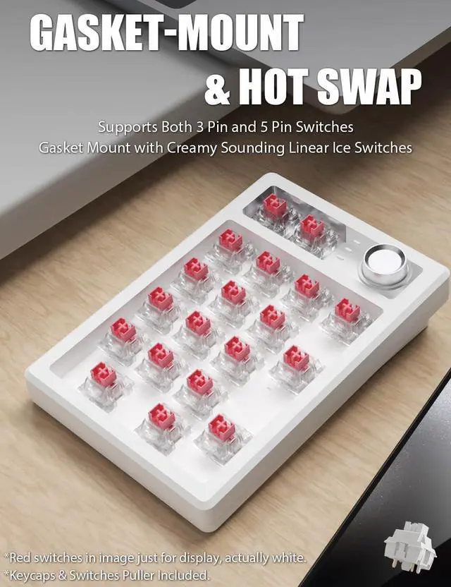 With gasket materials such as EVA foam and IXPE switch pads between the plate and housing on both top and bottom sides, the mechanical numpad provides a consistent, softer typing feel and pleasing acoustic feedback. The hotswap keypad supports both 3 pin and 5 pin switches. Comes with creamy sounding linear Ice switches, brings you a comfortable and pleasant typing experience.